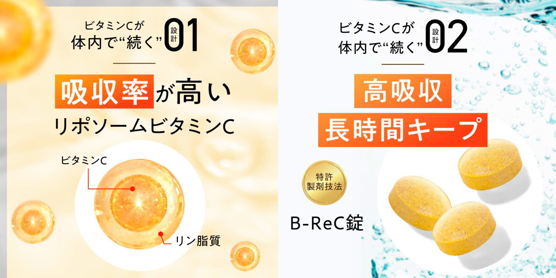 超微細なリポソーム技術でビタミンCが体の奥深くまで浸透し、体内での効果を最大限に引き出します。さらに、B-ReC技術によるコーティングで時間をかけて溶出し、長時間持続します。